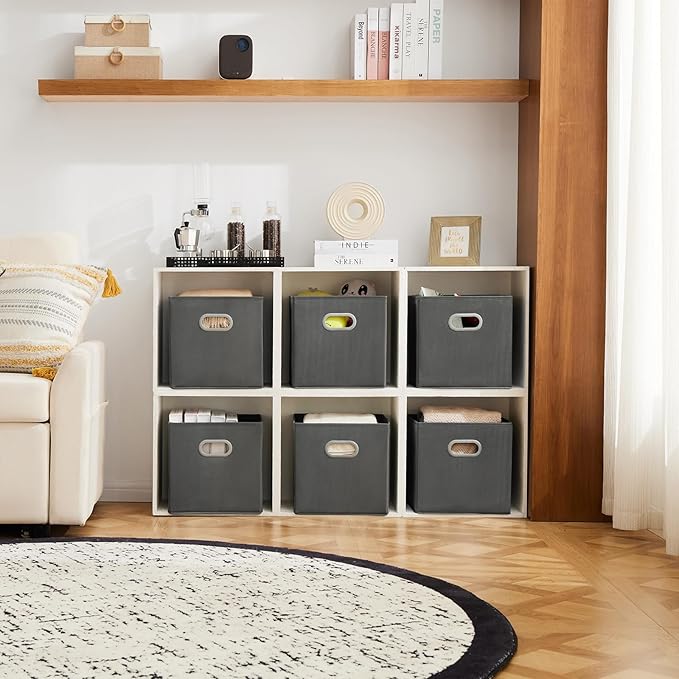 - [CUBE STORAGE BINS WITH HANDLE]:Double side plastic handles, do not affect the storage function while facilitating stable movement of the storage box and protect your hands. Simplicity design with color grey will enriches your closet and room.