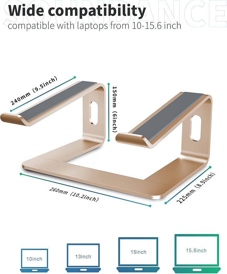 SOUNDANCE Laptop Stand, Aluminum Computer Riser, Ergonomic Laptops Elevator for Desk, Metal Holder Compatible with 10 to 15.6 Inches Notebook Computer, Gold