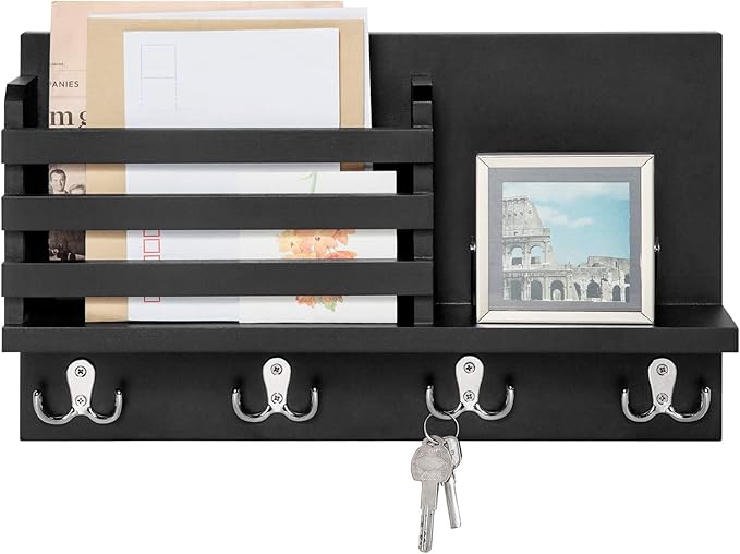 Dahey Wall Mounted Mail Holder Wooden Key Holder Rack Mail Sorter Organizer with 4 Double Key Hooks and A Floating Shelf Rustic Home Decor for Entryway or Mudroom,15.7" W x9.3 Hx3.2 D, Black