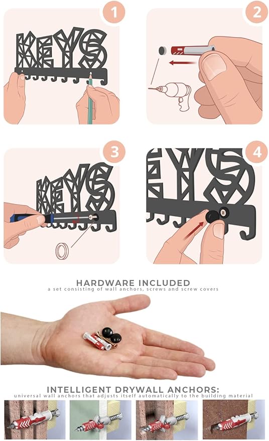 - Kit contents: Metal wall mounted key holder with premium expansion plugs and screws. Includes simple instruction manual. This organizer is perfect for home improvement or new apartment essentials kit
