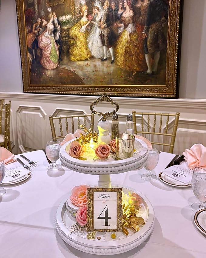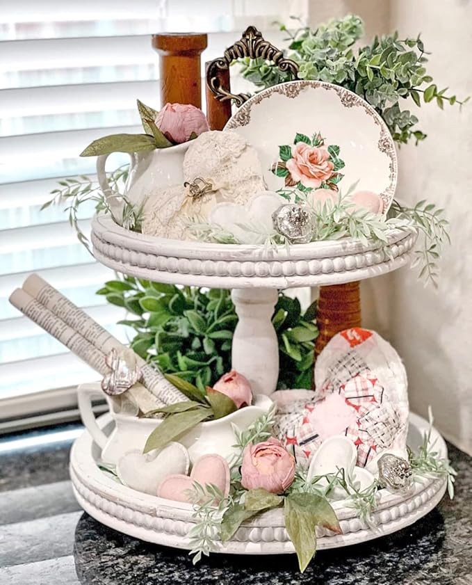 - πͺ΅πͺπΎ ELEGANT FARMHOUSE DECORATION - Add some charming decor to this 2 tiered decorative tray and use it as an ultimate two tier decorative tray, designed to fit perfectly into modern, rustic, or farmhouse interiors. Use this round tiered display stand for entertaining and for everyday organization. This elegant wooden tray for decor has a timeless appeal that complements any decor style. Display and organize with elegance using this white wood tiered tray.
