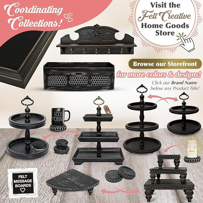 - π§βοΈπͺ΄ A VERSATILE CENTERPIECE - This stunning two tier farmhouse wood tray is designed to impress, a charming blend of rustic style and function. Perfect for organizing essentials or serving treats, this tiered wooden serving tray adds warmth to any space. Designed as a tiered dessert stand, itβs ideal for gatherings, coffee bars, or seasonal displays. Exclusively from the Felt Creative Home Goods Store, this elegant black two tiered tray is a must-have for farmhouse-inspired homes.