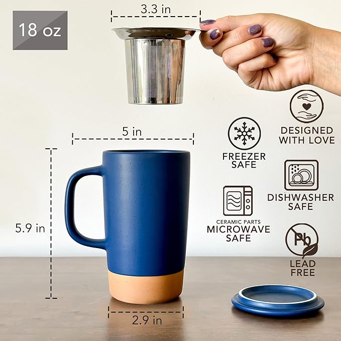 Mora Ceramics Large Tea Mug with Loose Leaf Infuser and Ceramic Lid, 18 oz, Portable, Microwave and Dishwasher Safe, Tall Coffee Cup - Rustic Matte Ceramic Glaze, Modern Herbal Tea Strainer, Deep Blue