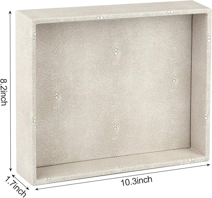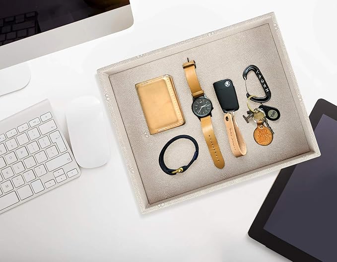 HofferRuffer Elegant Desktop Organizer, Vanity Tray, Bathroom Storage Tray Holder, Dresser Jewelry Tray, Change Coin Key Watch Catchall Tray, 10.2 x 8.4 x 1.8 inches (Light Grey Faux Leather Shagreen)