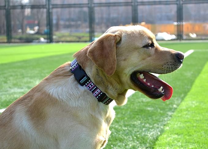 - 【DURABLE】 This dog collar is created by Polyester fiber which is strong and sturdy for pullers. The quick release plastic buckle is wear resistant , easy to on and off.
