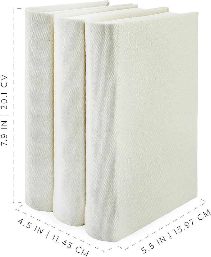 - SIZE: Books 7.9 x 5.5 inches and stack 4.5 inches tall; COLOR/MATERIAL: Cream canvas fabric exterior; interior tan cardboard