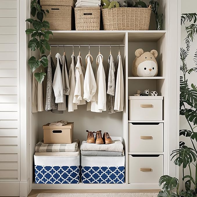 DECOMOMO Blue Storage Bins Fabric Storage Baskets for Shelves, Linen Closet Organization Toys Nursery (Blue Patterns, Large - 3 Pack)