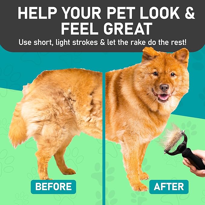 - EFFECTIVE DESHEDDING TOOL: Our dematting and deshedding tool gently removes loose hair and eliminates tangles, knots, dander, and trapped dirt. The perfect cat brush or dog grooming brush solution for pets with thick fur or dense double coats.
