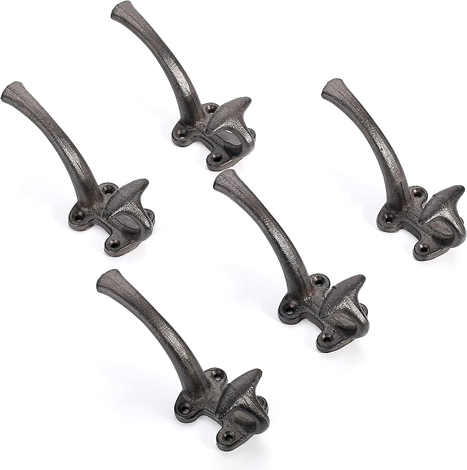 Ambipolar 5-Pack Decorative Cast Iron Heavy Duty Double Wall Hooks, Vintage Hooks in Antique Black Coat Hooks Wall Mounted for Mudroom, Hat Rack