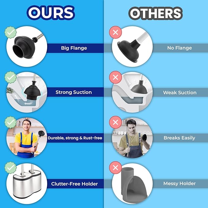 - POWERFUL TOILET PLUNGER WITH SUPERIOR SUCTION: features an upgraded plunger cup and pull-out flange for a secure fit on all bowl types, delivering efficient clog removal with minimal effort