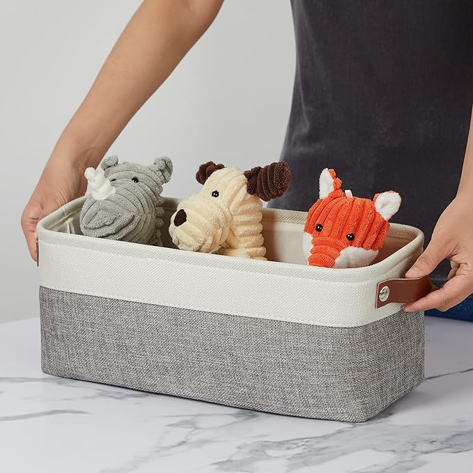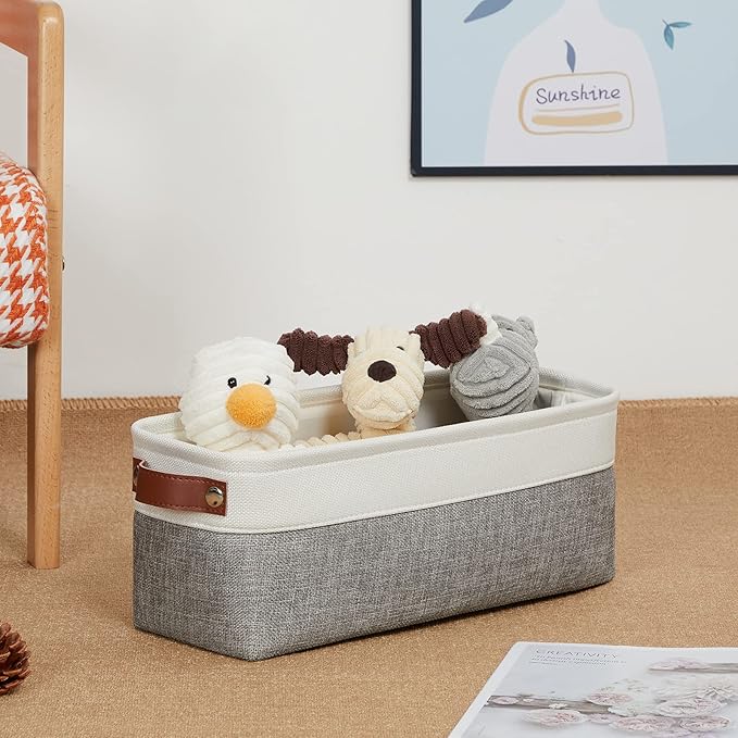 - 【Unique Design & Modern & Decorative】Set of 2 small toilet paper baskets, dimensions(each): 15(L) x 6(W) x 5.5(H) inches. Fabric storage baskets bring you organizing convenience and a sweet home. Great for socks, underwear, books, magazines, toys, pet products, wipes, towels, decorations, office supplies, DVDs, and gifts. The fabric baskets with neutral colors can match a lot of home styles - keeping your home nice and tidy.