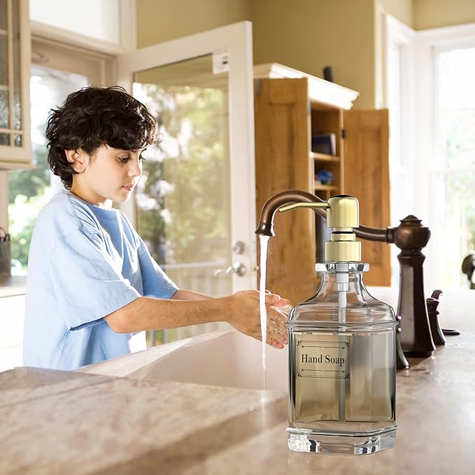 - Thick Glass Soap Dispenser - Made Of thickened High-Quality Glass, natural and safe to fill with a variety of room-temperature daily use liquids. Anti-fingerprint, the Sturdy Pump Is Made By Premium Gold Color Soap Dispenser Pump Which Can Kept Long Lasting Bright That Not Easy Corrode Or Rust.