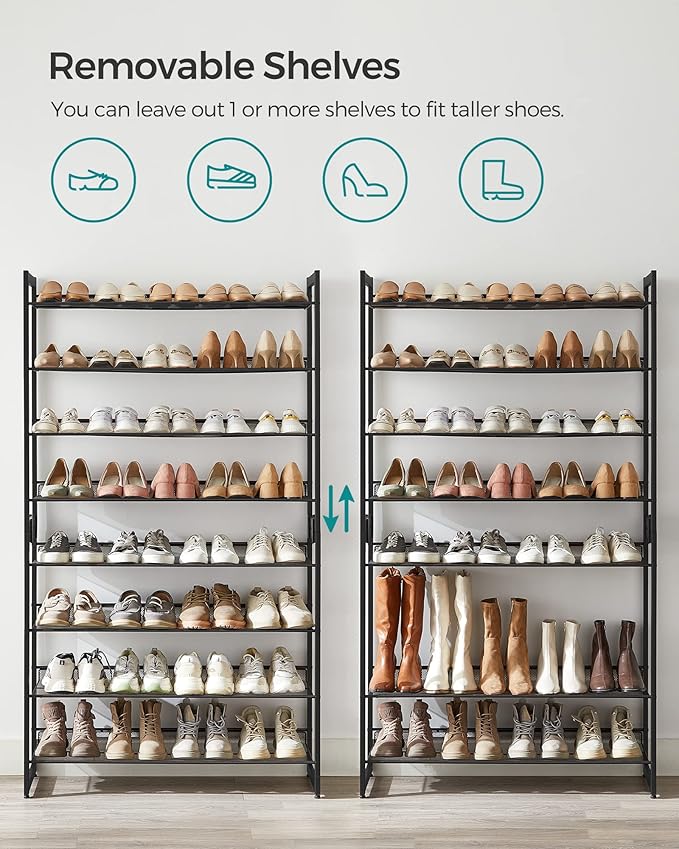 - [Customizable As You Need] You can choose to assemble the shelves flat or at an angle for easier access to shoes. Also, you can choose to split the tall shoe rack into 2 separate 4-tier racks for different rooms, or keep them stacked as an 8-tier rack