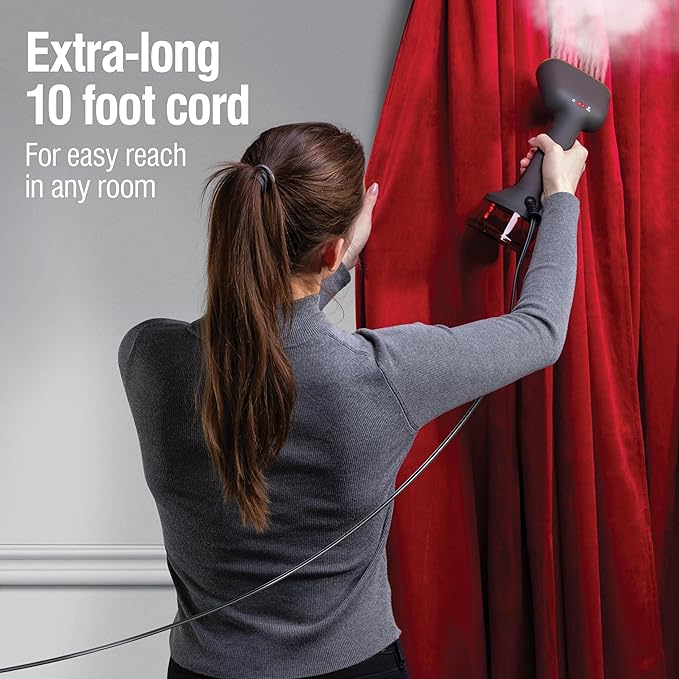 - 10 FT CORD: This compact CHI handheld steamer features a 10 ft. cord for easy access to hard-to-reach areas like drapes. Includes a power cord, detachable fabric brush, and comes with a 2-year limited warranty for reliable, long-lasting performance.