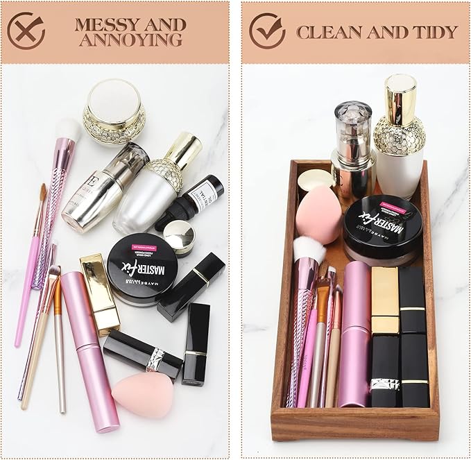 - MULTI-PURPOSE USE RECTANGULAR WOODEN TRAY: This wooden tray can help you keep small things stored and properly organized. Perfect for storing any small items such as toilet paper, toothbrush holders, hand towels, toiletries, cosmetics, candles, perfumes, jewelry, office supplies, crafting supplies, collectibles and more. In order not be messy, please act immediately.