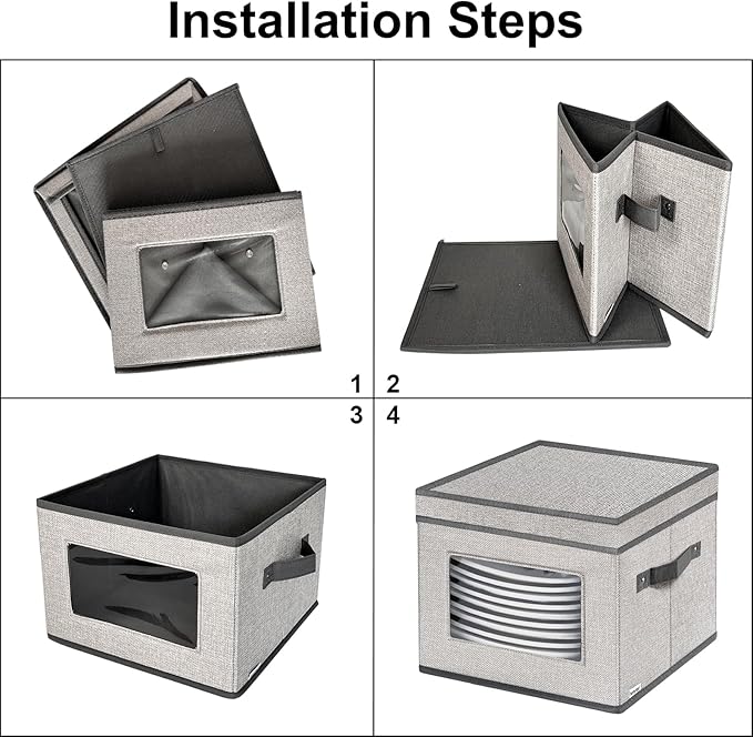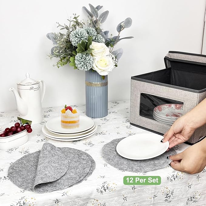 - 【Measurement】: The Dinnerware Storage Box measures 12 x 12 x 8 inches(30.5cm x 30.5cm x 20.3cm), Each box come with 12 felt dividers and can hold up to 12 pieces of 8" (or smaller) diameter dishes.