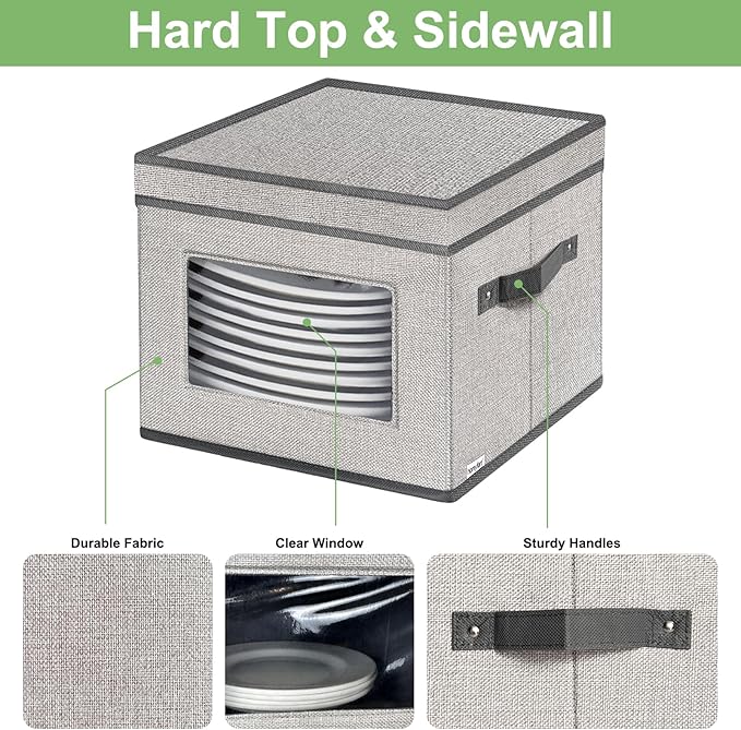 homyfort China Storage Containers With Lid and Handles, Dinnerware Storage Box for Dishes with 12 Felt Dividers, Hold 24 Plates,12 x 12, Set of 2, Light Grey