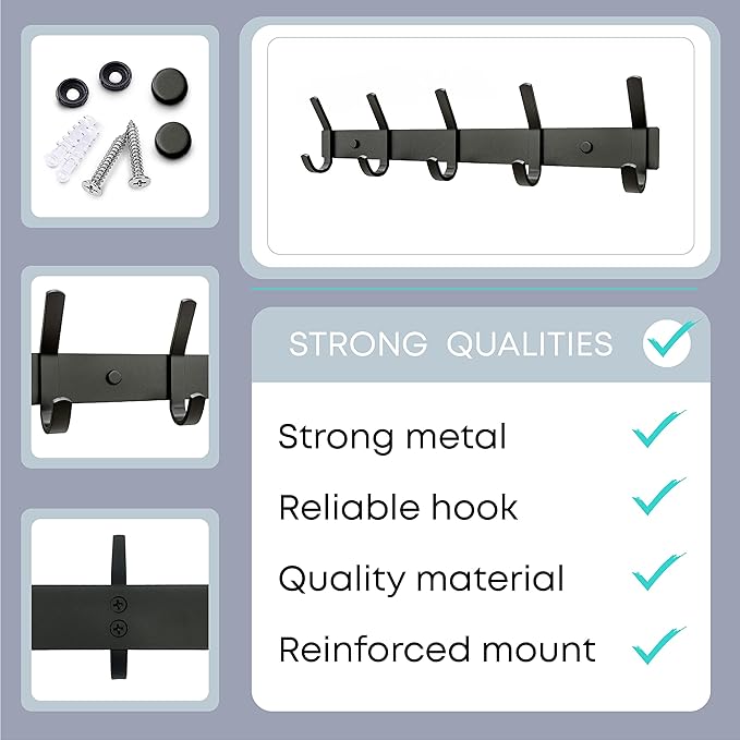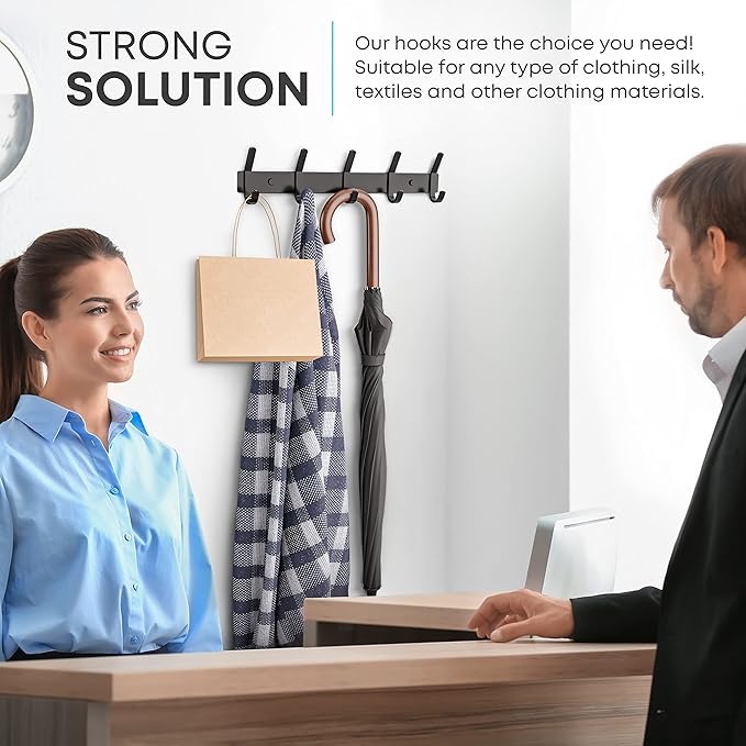 - ✅【5 Double Hooks for Maximum Storage】Features 5 durable double hooks (10 hanging points), perfect as a coat and hat rack, wall hook organizer for jackets, towels, scarves, robes, bags, and keys.