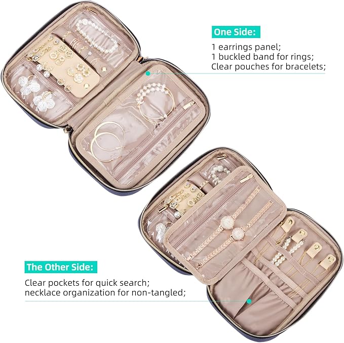 - WELL-ORGANIZED -With designated areas for earrings, rings, necklaces and bracelets .This jewelry case will keep you organized on the go and keep all your precious jewels in order