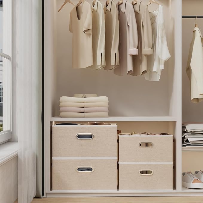 Yawinhe Collapsible Storage Box, Cube Storage Basket, Fabric Foldable Storage Bins Organizer Containers with Dual Leather Handles for Home Bedroom Closet Office,15.0 x 9.8 x 8.3 Inch, (Beige, 4-Pack)