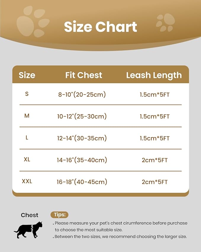 - TIPS FOR CAT HARNESS: We are now upgrading our cat harness with more size and color choices! Please measure your cat's chest and choose suitable size refer to the size chart before purchasing our cat harness and leash set, there may be some differences between different breeds of cats. This harness also suit for small dogs, the same please measure your dog's chest before purchasing this harness and leash escape proof