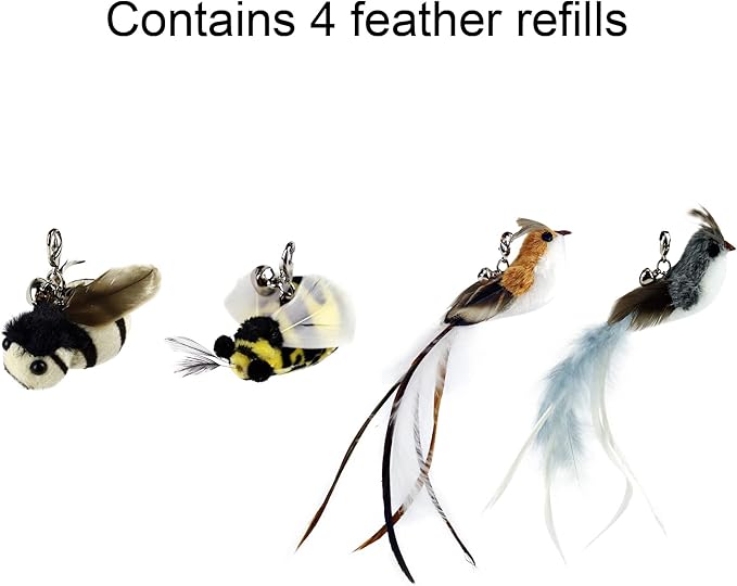 - 3. Creative design: 4 feather toys use 3 kinds of small animals that can fly: bird, wasp, cicada, they make cats full of curiosity. Swing the feather "bait" to get the cat excited, trigger the "hunting instinct", let them run and jump like wild animals, and make your cat go crazy with joy!