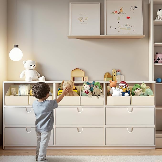- 【Trapezoidal Design】These storage cubes are Trapezoid design that makes finding things convenient, also allows easy access when putting on the highest shelf. These are ideal closet bins for clothes, bags, shoes, towels, blankets, toys, dolls, and more