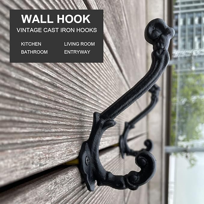 4 Pack Cast Iron Wall Hooks Antique Vintage Rustic Farmhouse Coat Hooks, Great for Coats, Bags, Towels, Hats, Mounting Screws Included