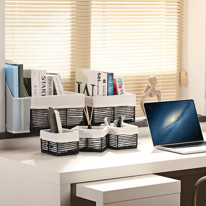 Vagusicc Wicker Storage Baskets, Hand-Woven Paper Rope Black Baskets for Storage, Rectangular Small Wicker Baskets for Organizing, Cube Storage Bins for Closet/Clothes/Dresser, Black, 5-Pack