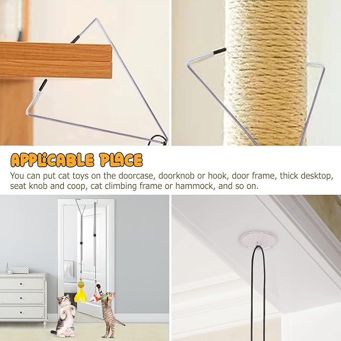 - [Longer & 100% Thicker Rope]- The elastic rope is 78 inches long, which can be adjusted according to your needs, about 0.1 inches thick, 100% thicker than the others, more durable, and not easy to be damaged by cats. You can use triangular clip to clip to the door frame or stick to the door frame with the sticky pad. Hanging cat toys can cover a lot of play space and can really let your cat get exercise.