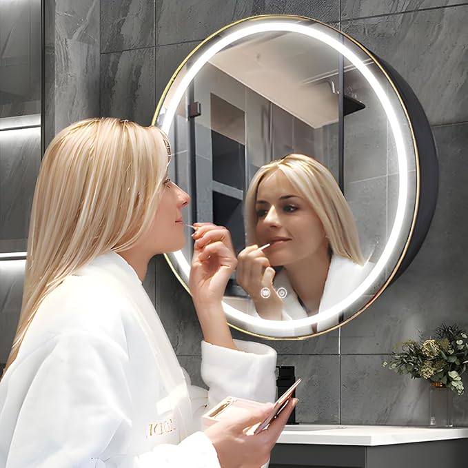 30 inch Round Medicine Cabinet with Lights,Led Medicine Cabinet with Defogger,Illuminated Mirror Cabinet for Bathroom,Dimmable,Defogger,3 Color Temperature 3000k-6500k Black