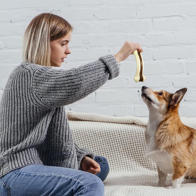- Bone Chew Toy: the toys for aggressive chewers are designed in realistic bone shape, which can easily catch your dog's attention, reduce their anxiety and boredom; Interesting and curved design makes the toys easy for dogs to chew; These tough dog bones are beef flavoring, and you can also put pumpkin puree(not included) on the toys to attract your dogs