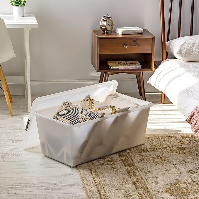 IRIS USA 91 Qt Stackable Plastic Storage Bins with Lids, 4 Pack - BPA-Free, Discreet Organizing Solution, Latches, Durable Nestable Containers, Secure Pull Handle, Made in USA - Pearl