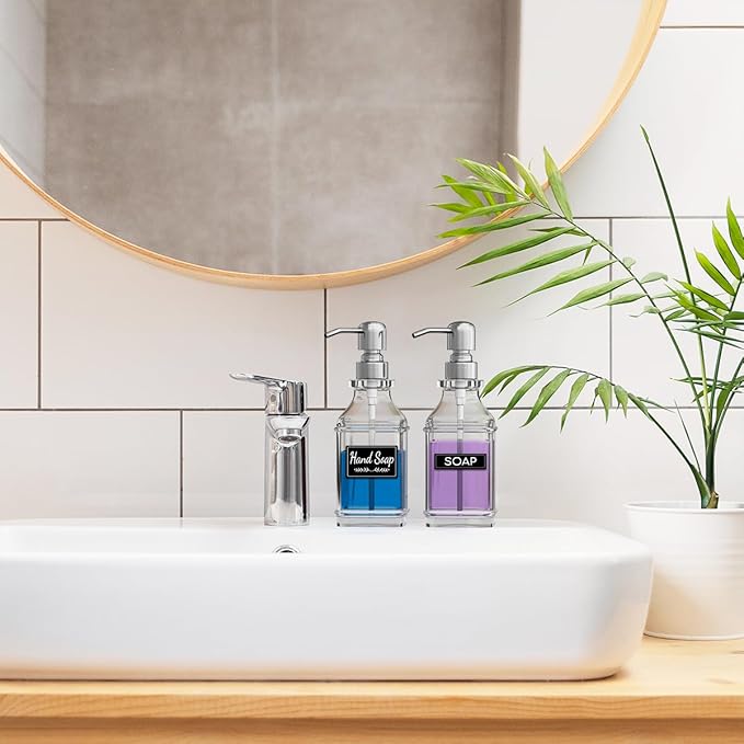 - Superb Quality Soap Dispenser - Made Of thickened High-Quality Glass, natural and safe to fill with a variety of room-temperature daily use liquids. Anti-fingerprint, the Sturdy Pump Is Made By Premium Silver Soap Dispenser Pump Which Can Kept Long Lasting Bright That Not Easy Corrode Or Rust. Reusable & refillable soap dispenser set helps you get organized.