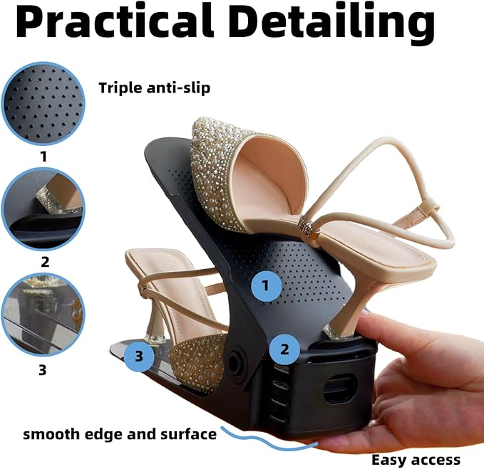 - Four-POSITION FLEXIBLE ADJUSTABLE - Adjustable heights from 2.7'', 4.3'', 6.4'' to 7.2'', perfect for all kinds of shoes, whether it's flat shoes or high heels (the size should bellow 9). With a fine size design, you don't have to worry about the shoes being squeezed