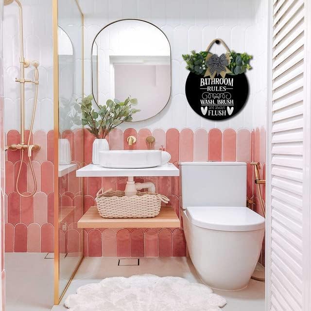 Farmhouse Bathroom Decor,Bathroom Rules Sign,Rustic Round Wooden Wreath Sign,Funny Bathroom Decor Wall Art For All The Seasons