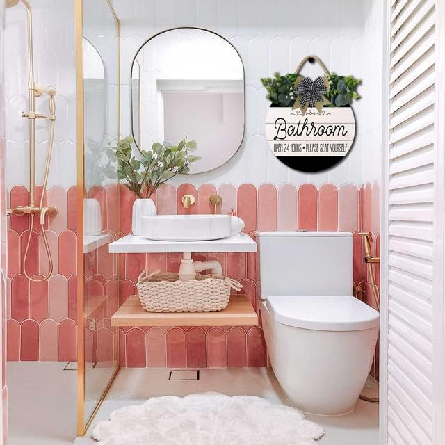 Bathroom Decor,Bathroom Open 24 Hours Please Seat Yourself Sign,Rustic Round Wooden Wreath Sign,Modern Farmhouse Home Accent For All The Seasons