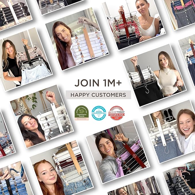 - EASILY LOAD & UNLOAD YOUR CLOTHES - With the 360 degree swivel hook on our tiered hangers for clothes makes it easy to access, hang, & grab your skirts, shorts, & other clothes items. The clips on our skirt organizer for closet adjust to fit the width of your clothes so you spend less time loading clothes.