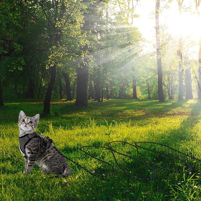 - [Safety material] Our cat Leash is woven from soft nylon, very strong and durable, light weight, and black eye-catching design, which makes it look fashionable. Its design is tangle-free and will not be entangled by bushes. Pets will be happy to roam safely outside, will not chase birds and wild animals, and will not keep our eyes on her 100% of the time. Very suitable for hiking, camping, training, hunting, backyard, beach, memory training, outdoor tennis, etc.