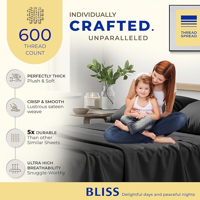 THREAD SPREAD 100% Egyptian Cotton Twin Size Sheet Set - 3 PC 600 Thread Count Egyptian Cotton Sheets Set for Twin Size Bed (Black), Soft, Cooling, Luxury Hotel 16" Deep Pocket Sateen Bedsheet