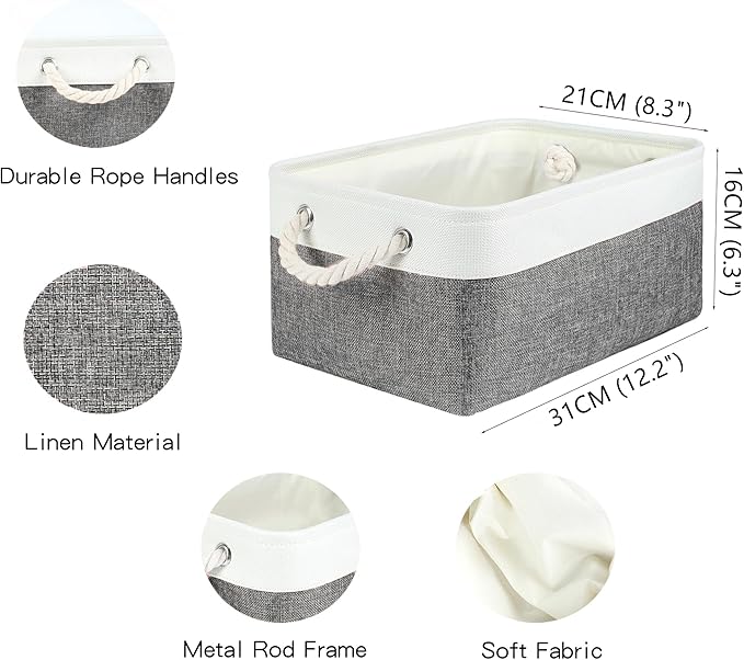 Storage Bins with Sturdy Cotton Handles(1 Pack), Fabric Storage Baskets for Organizing use for Office & Home, Book, Clothes, Toys, Closet Boxes (Small, Grey-White, 12.2x8.3x6.3 inches)