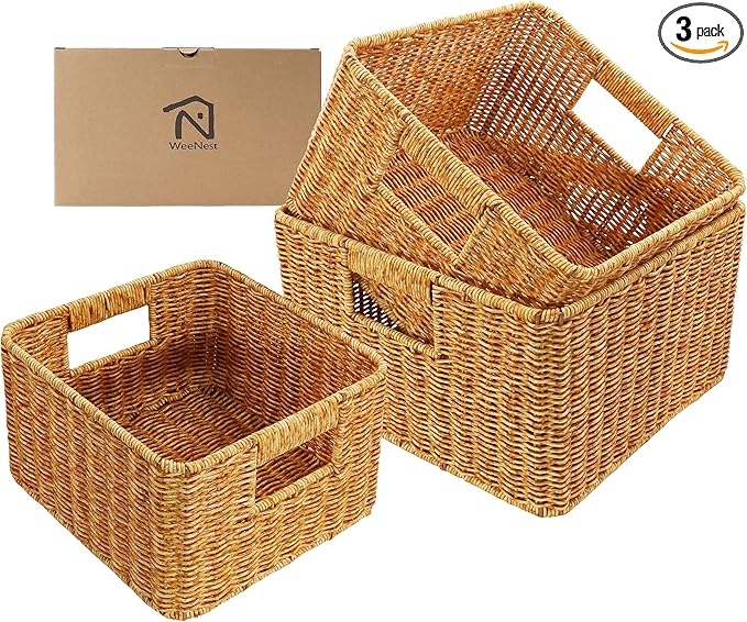 Baskets with Handles, Wicker Storage, Shelf Boxes for Organizing, Decorative Resin, Set of 3, Amber