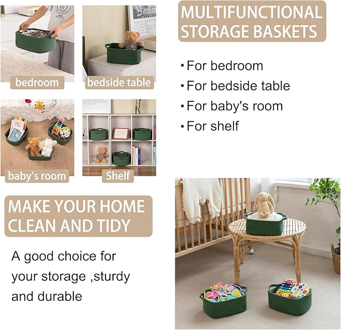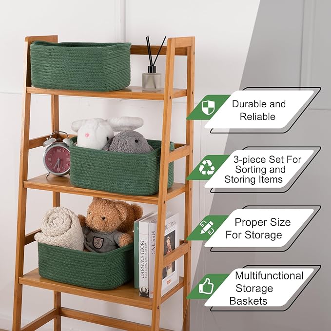 OIAHOMY Cotton Rope Woven Baskets for Storage, Nursery Rectangle Storage Basket with Handles for Shelves, Pack of 3, Green