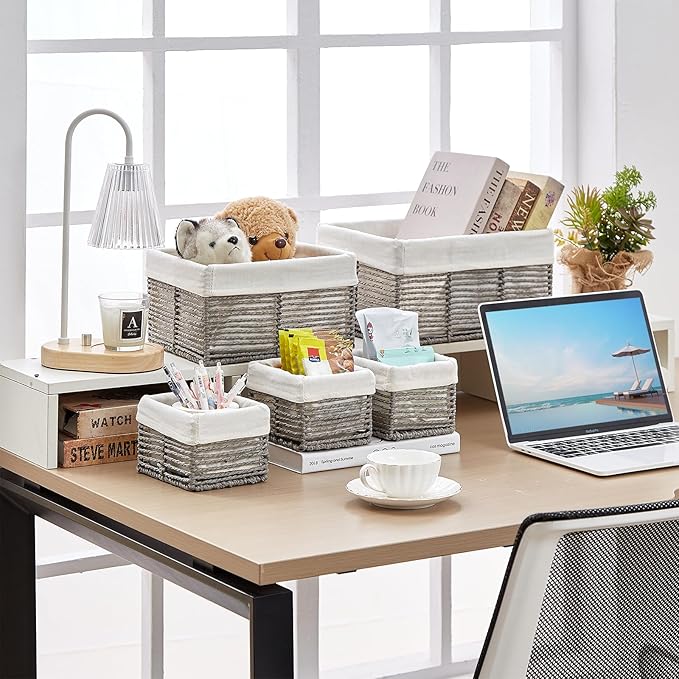 Vagusicc Wicker Storage Basket, Hand-Woven Paper Rope Wicker Baskets, Rectangular Small Wicke Baskets for Organizing, Cube Storage Bins for Closet/Clothes/Dresser, Grey, 5-Pack