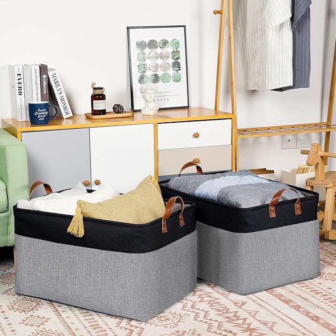 DULLEMELO Extra Large Storage Basket 22X15, 70L Foldable Fabric Toys Baskets Organizer Bins, Black&Grey