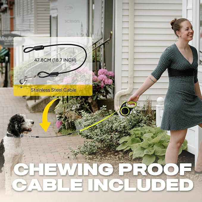 - 【Safe Reflective Dog Leash with Chewing Proof Cable】: Safety is our priority! This reflective retractable dog leash with reflective stitching and stickers enhance visibility in low-light conditions, keeping you and your precious pup safe during evening walks or outdoor adventures. Additionally, the chewing-proof cable provides free added durability and resilience against teething puppies or chew-happy dogs.