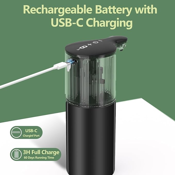 - USB/C TO C FAST CHARGING - Say goodbye to the hassle of frequent charging! The package includes a high-speed USB toType-C charging cable for the automatic soap dispenser, and a fully charged soap dispenser can be used for up to 2 months.