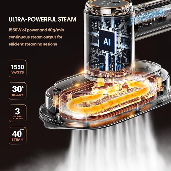 - [Professional Steam Station Iron] Featuring a powerful 1550W system, this steamer heats up in just 30 seconds and uses advanced PSA steam technology with 3 settings, delivering up to 40g/min of steam. With a detachable 1.2L tank for 40 minutes of steaming, wrinkle removal becomes quick and effortless, elevating your ironing routine.