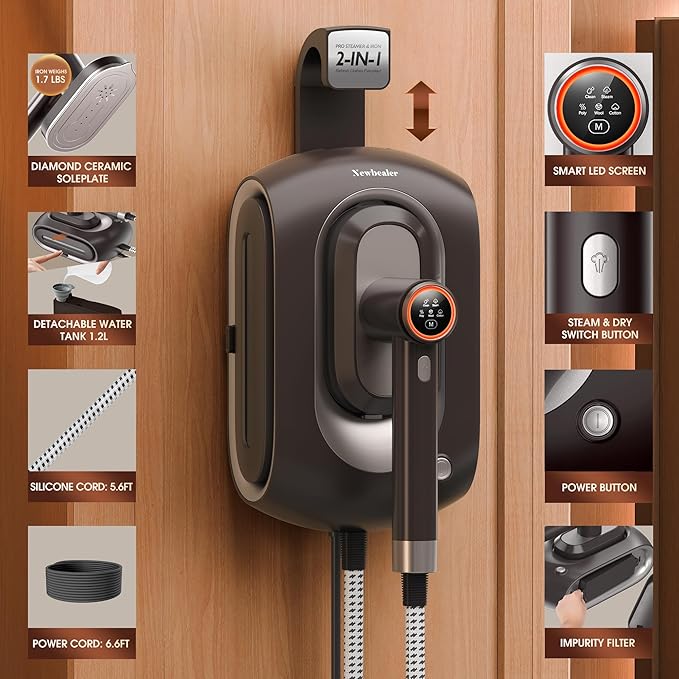 - [Innovative Storage & Chic Ironing] Perfect for modern homes, this handheld steamer offers flexible hanging with a hook and wall-mount option, ideal for balconies, entryways, or closets. Its space-saving design ensures a clutter-free ironing experience and blends seamlessly into any area for easy storage.