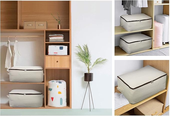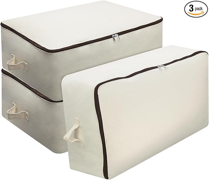 Omygarden 3 Pack Clothes Storage Bag Organizer with Sturdy Zipper for Quilts, Sweaters, Beddings, Blanket, Blouses and More, Beige